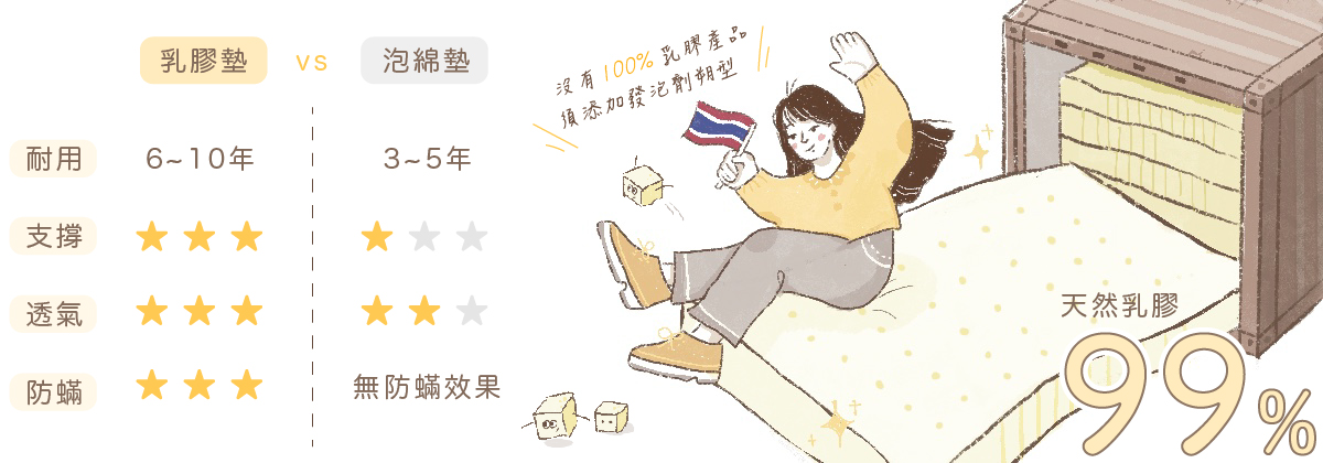 乳膠密度、純度都會影響乳膠的支撐性,天然乳膠成分較高的乳膠產品按壓時可以感覺