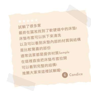 昨天和今天帶家人去試躺床墊,床墊真的很好睡!不會強迫推銷貴的床墊,只會推薦最適合的床墊!重點360度全開式可以看到內層材料是最吸引我的地方!高達99趴天然乳膠和手工獨立筒也是我選擇它最大原因!