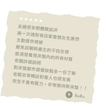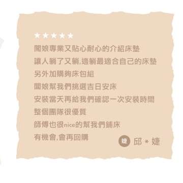 老闆娘專業分析挑床關鍵,希望我們選擇適合的床墊,卻不是一昧推薦高單價商品給顧客,真的是有良心的商家!!商品高品質,闆娘熱情又專業,讓人信賴!!